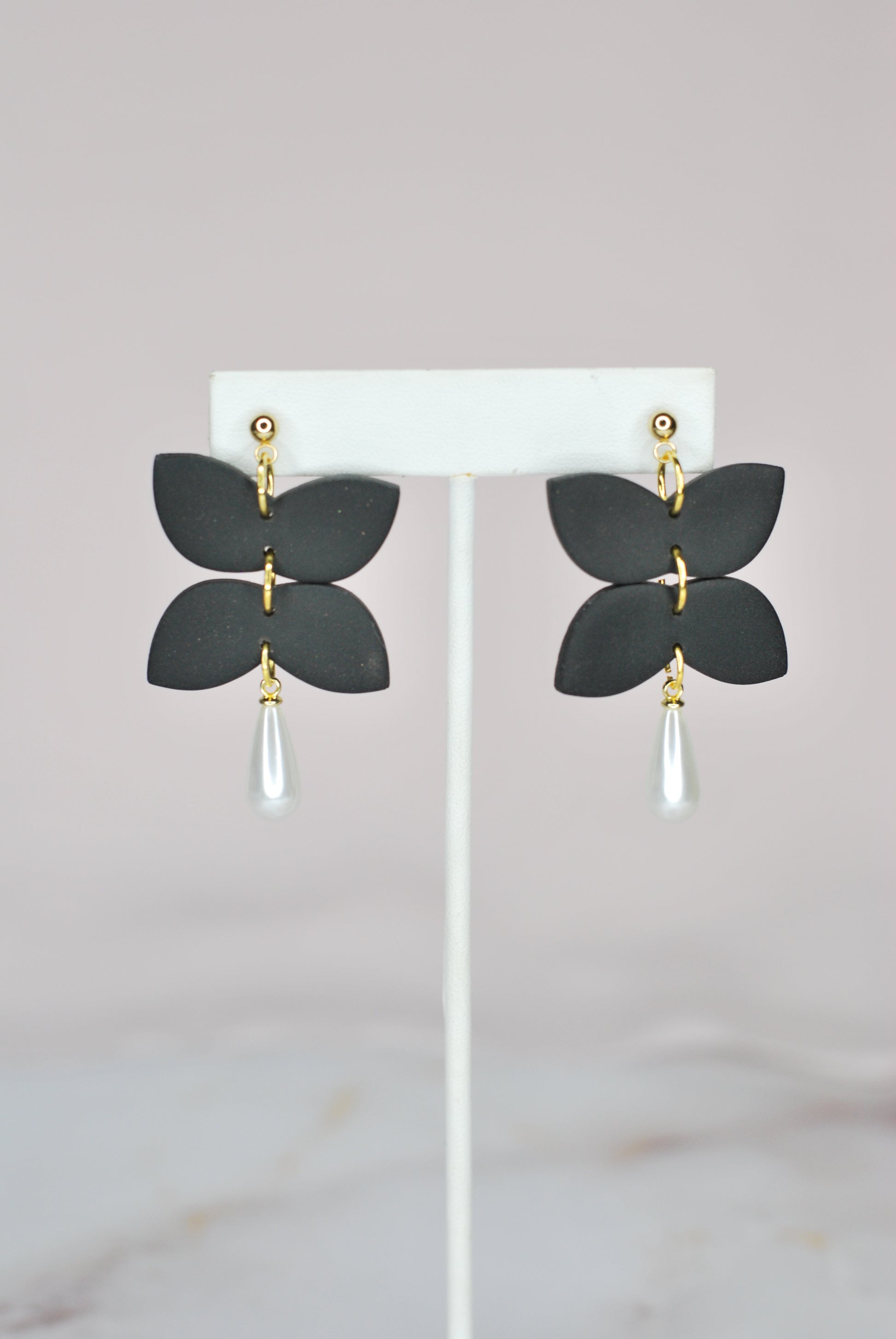 Black polymer clay earrings with a pearl dangle.