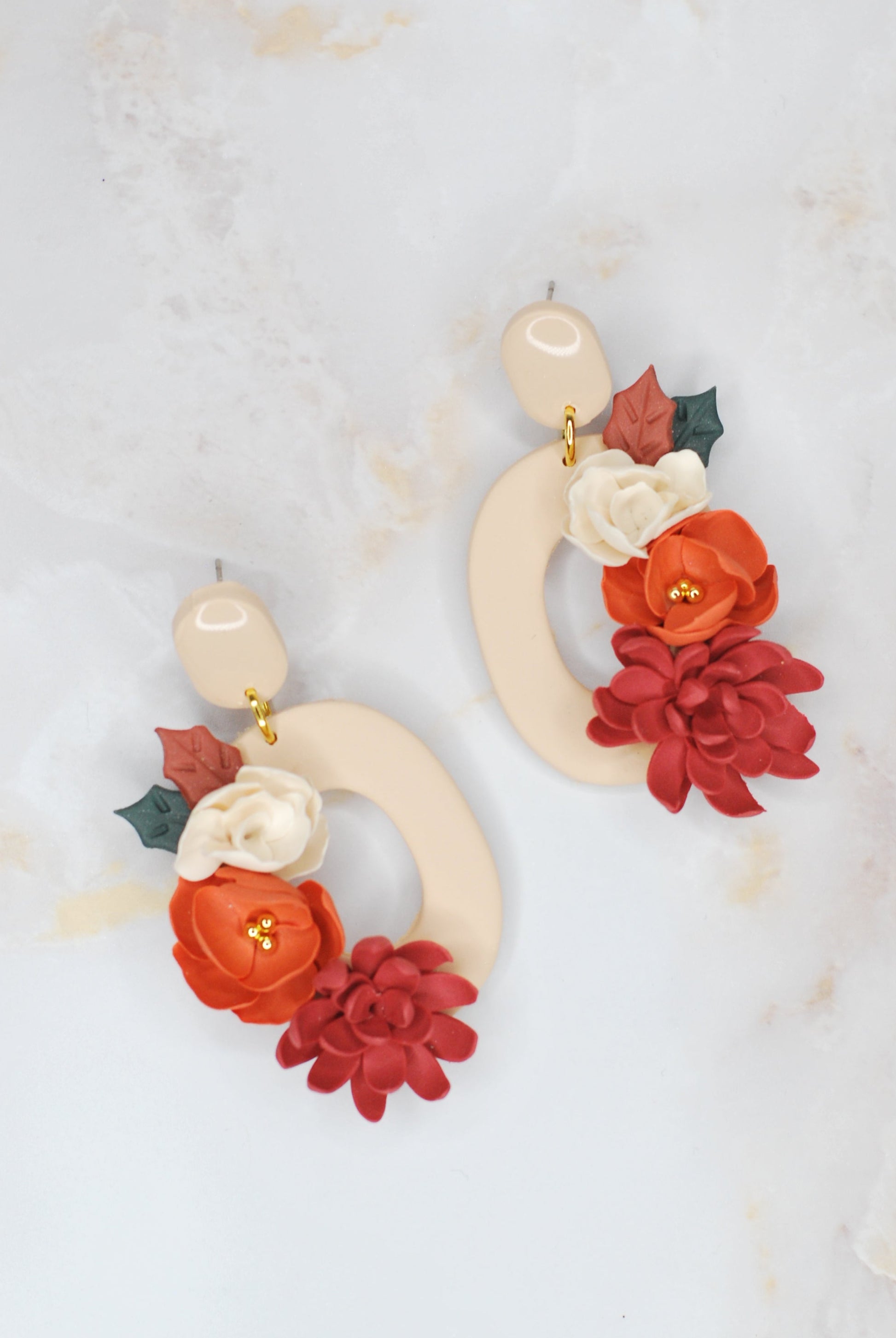 Warm orange, deep red and cream flowers on a tan oval earring.