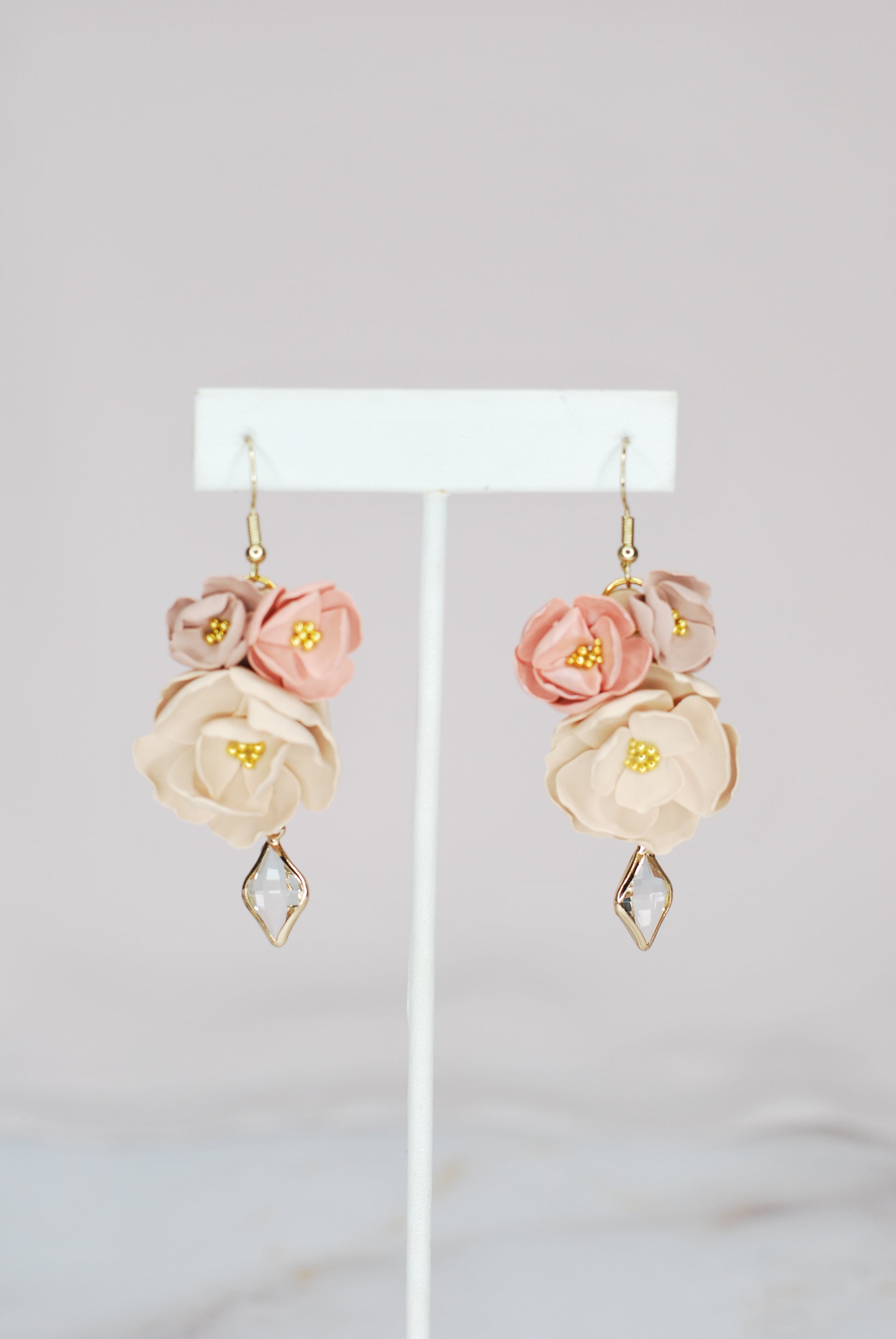 Tan, cream, and coral flower bouquet with a crystal dangle.